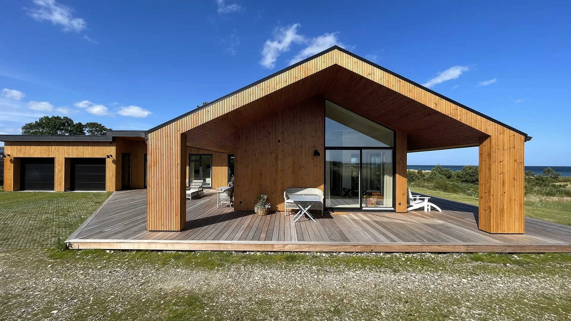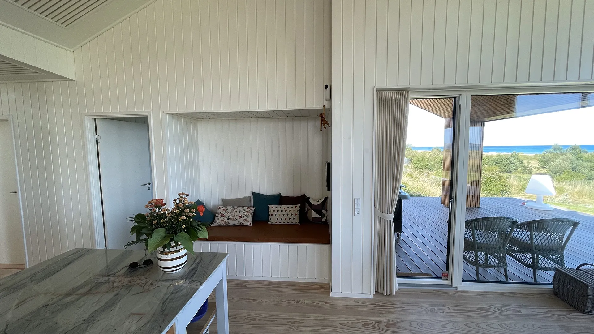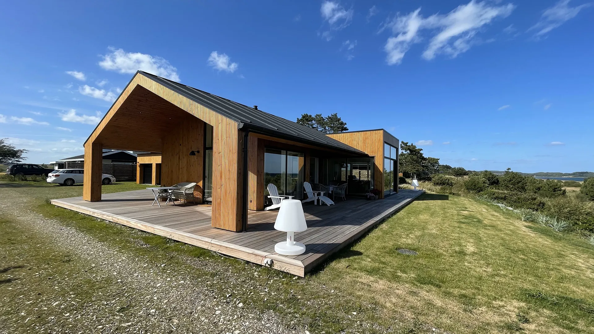Hele vejen rundt om sommerhuset omkranser en rummelig træterrasse, der inviterer til udeliv og forlænger boligarealet under åben himmel. Her kan man nyde solen, udsigten og den friske havluft, uanset om man slapper af med en bog, spiser middag eller samles med familie og venner.