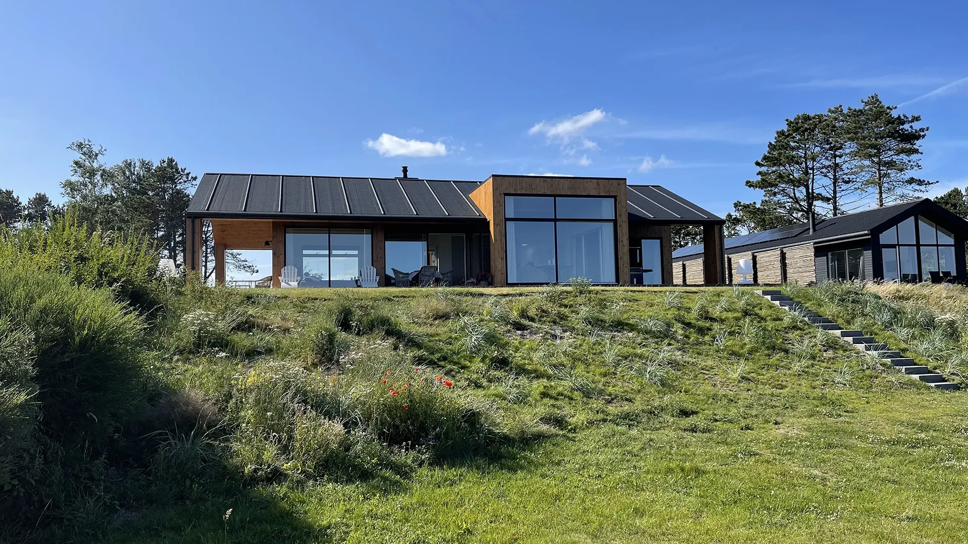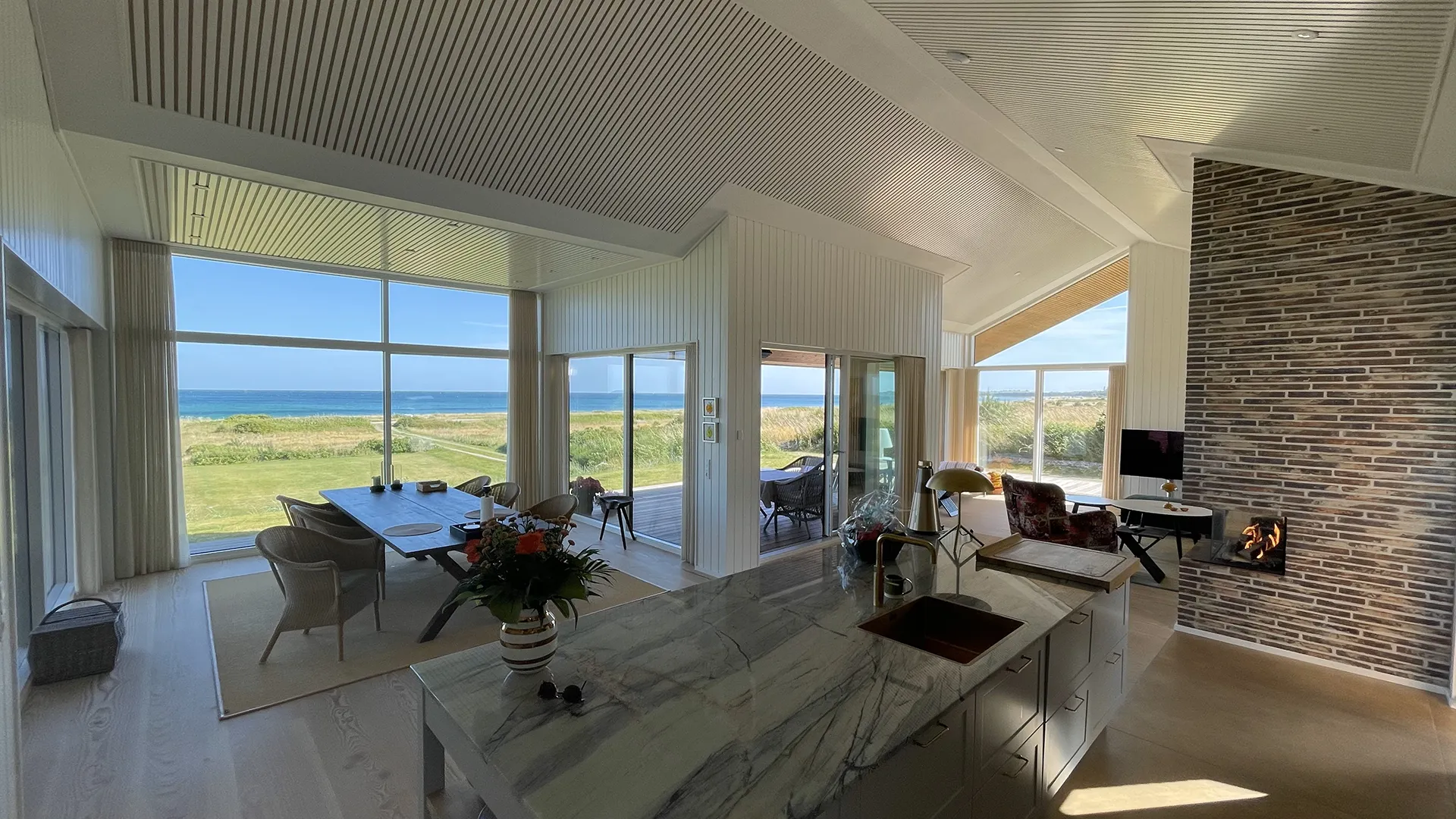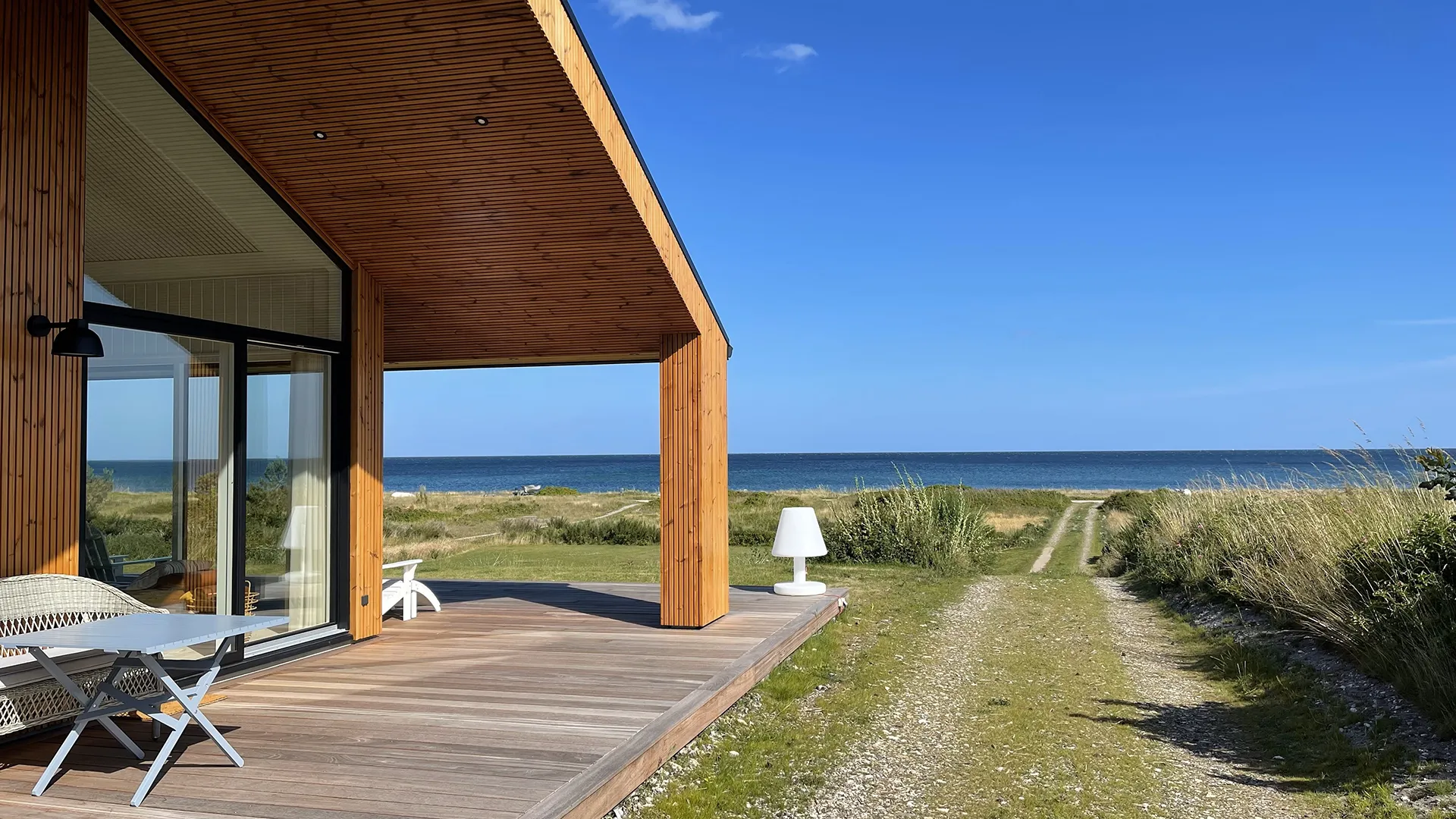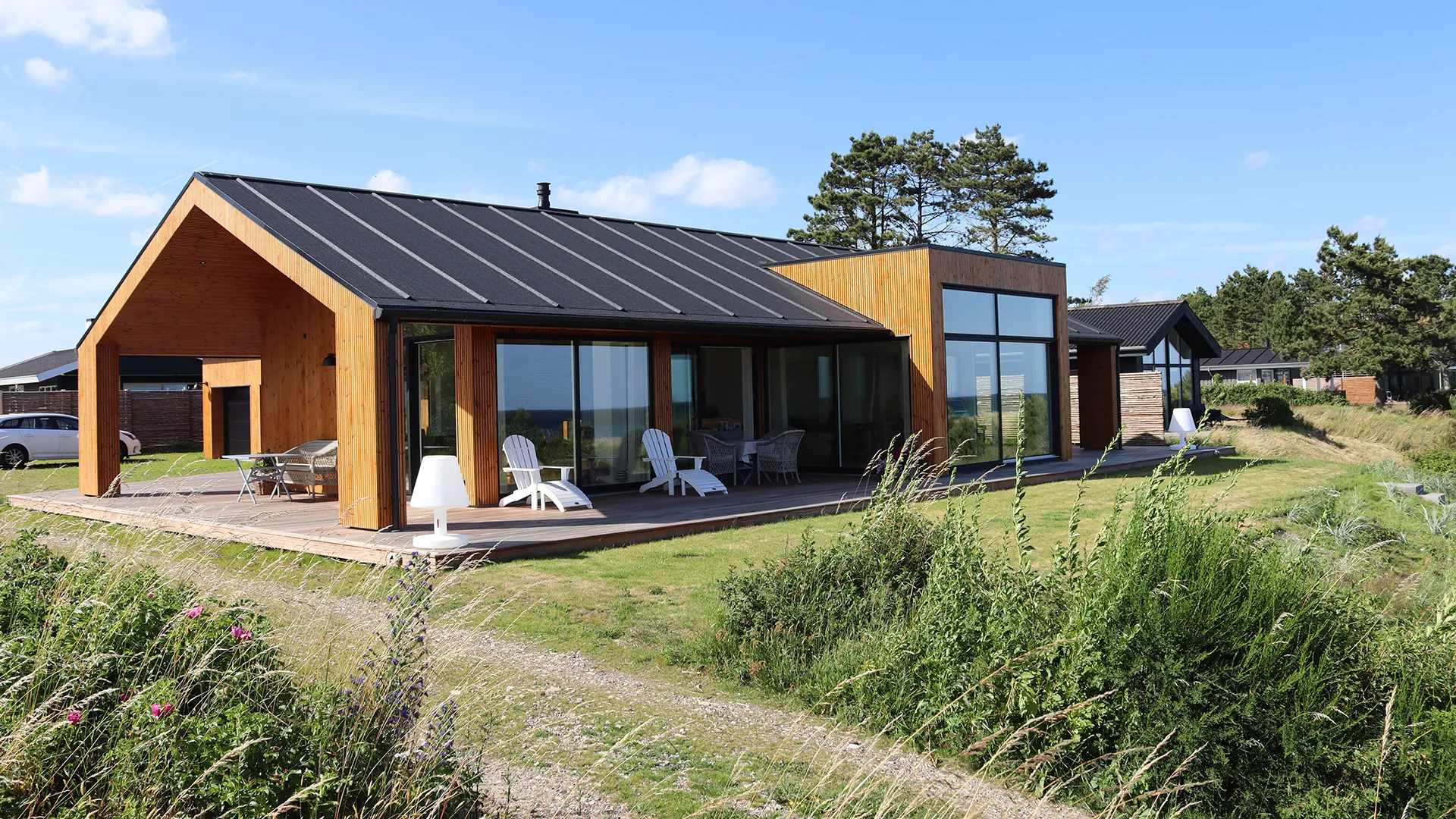 Hele vejen rundt om sommerhuset omkranser en rummelig træterrasse, der inviterer til udeliv og forlænger boligarealet under åben himmel. Her kan man nyde solen, udsigten og den friske havluft, uanset om man slapper af med en bog, spiser middag eller samles med familie og venner.