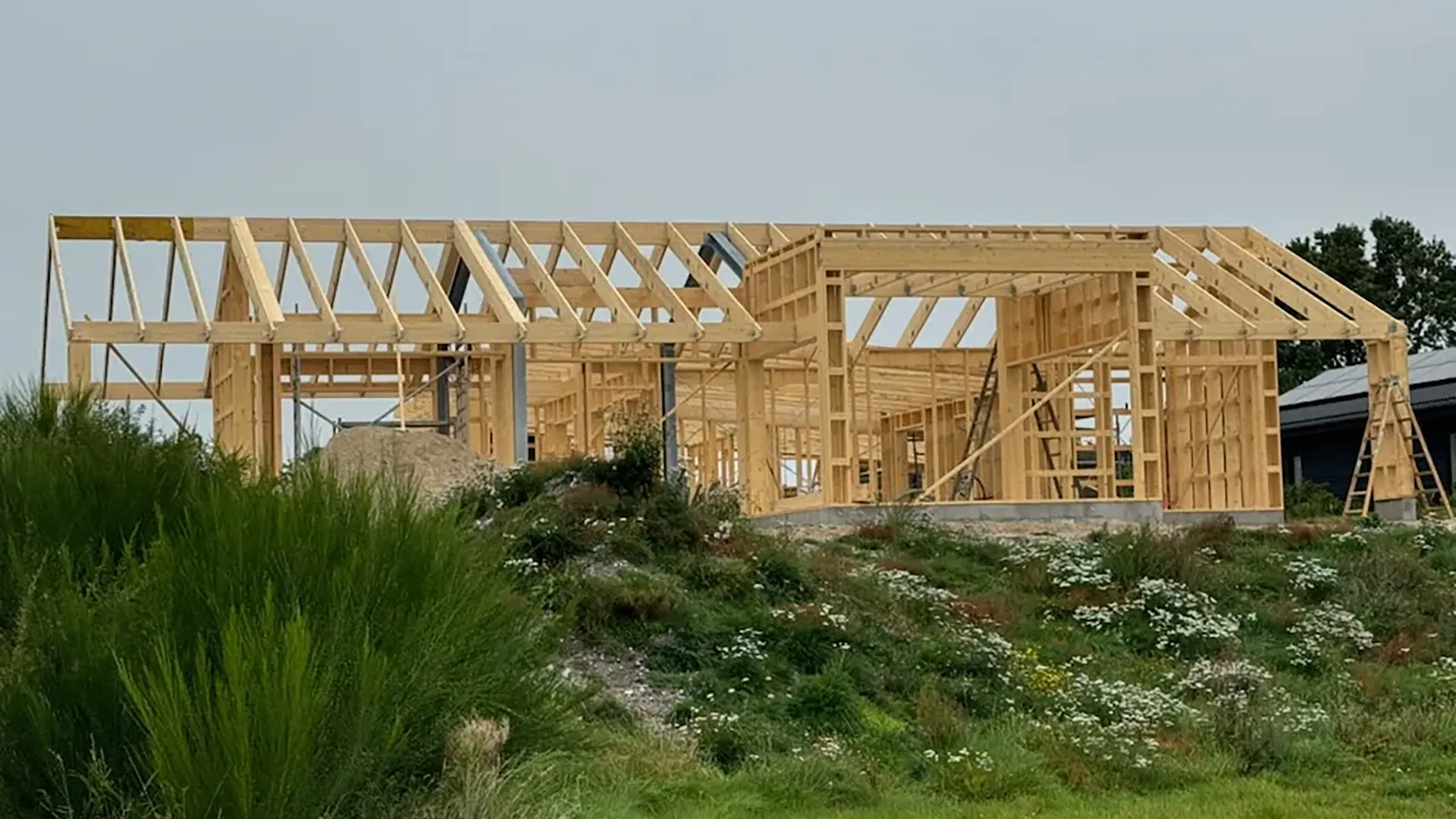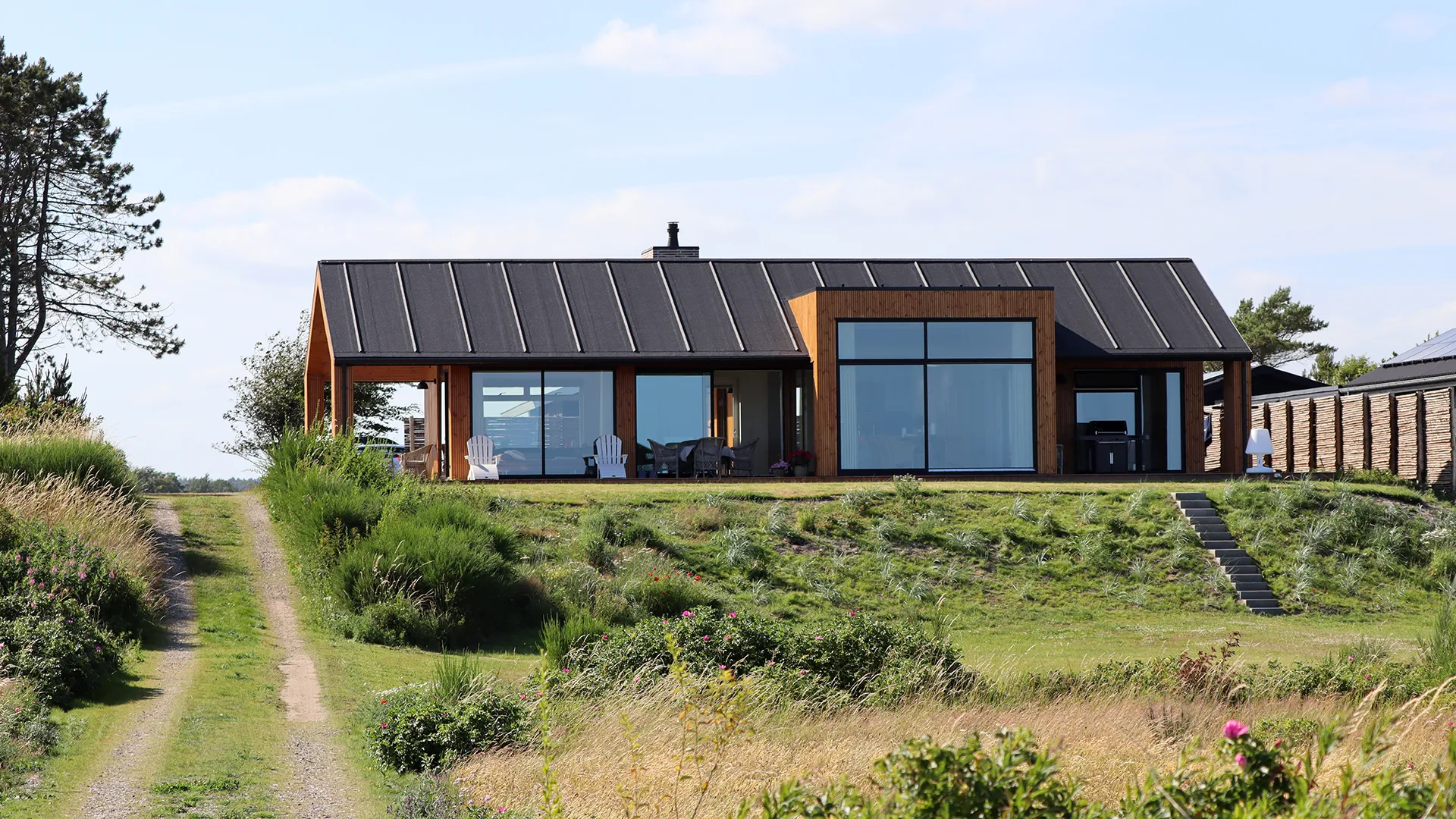 Udvendigt er huset beklædt med smukke Thermowood-brædder fra et lokalt savværk, der med sin varme glød og naturlige patina skaber en harmonisk overgang mellem bygning og natur. De elegante Outline Daylight vinduer og store skydedøre maksimerer lysindfaldet og visuel kontakt med udearealerne, mens de samtidig sikrer et optimalt indeklima i forening med de brede udhæng og overdækninger.