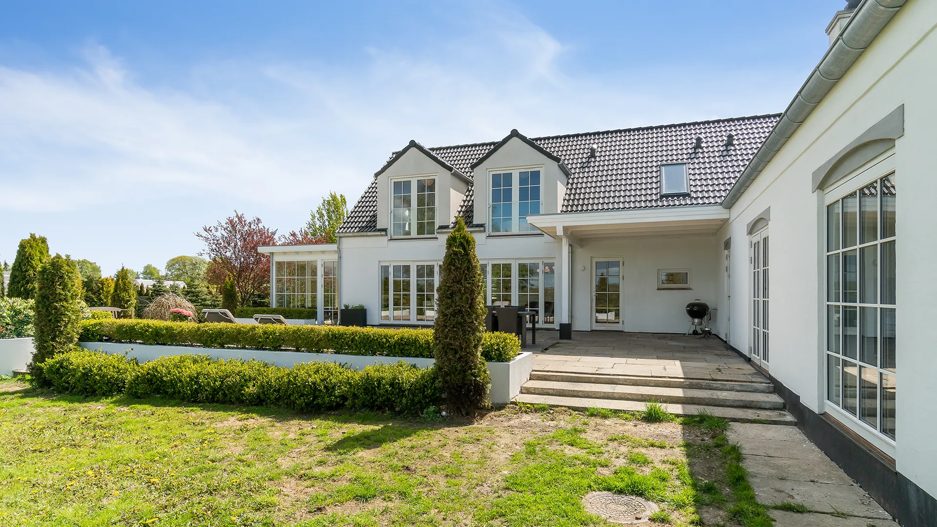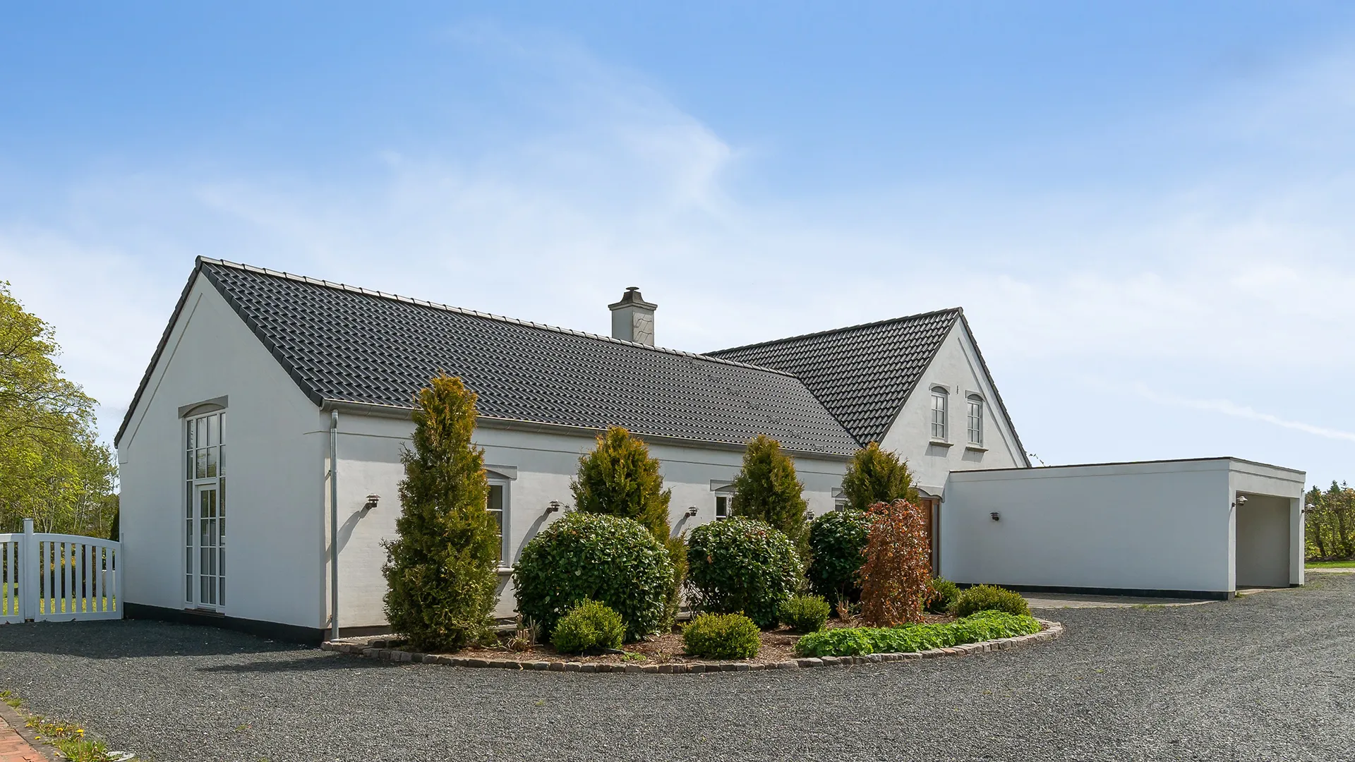Hovedhuset gennemgik en lignende transformation. Køkkenet, boligens hjerte, blev åbnet op med store glaspartier og fornyet med en kombination af tidløst design og moderne funktionalitet. For at optimere lysindfald og indretningsmuligheder på førstesalen tilføjede vi to elegant designede kviste, der ikke blot gav mere plads, men også et markant løft til husets æstetik. En smuk vinterstue blev tilføjet, hvilket nu forlænger sommerhalvåret betragteligt og skaber et fleksibelt rum for liv og samvær.