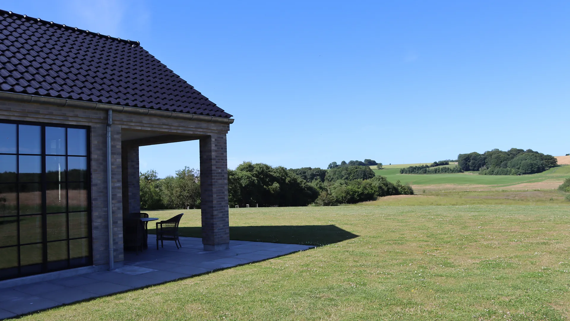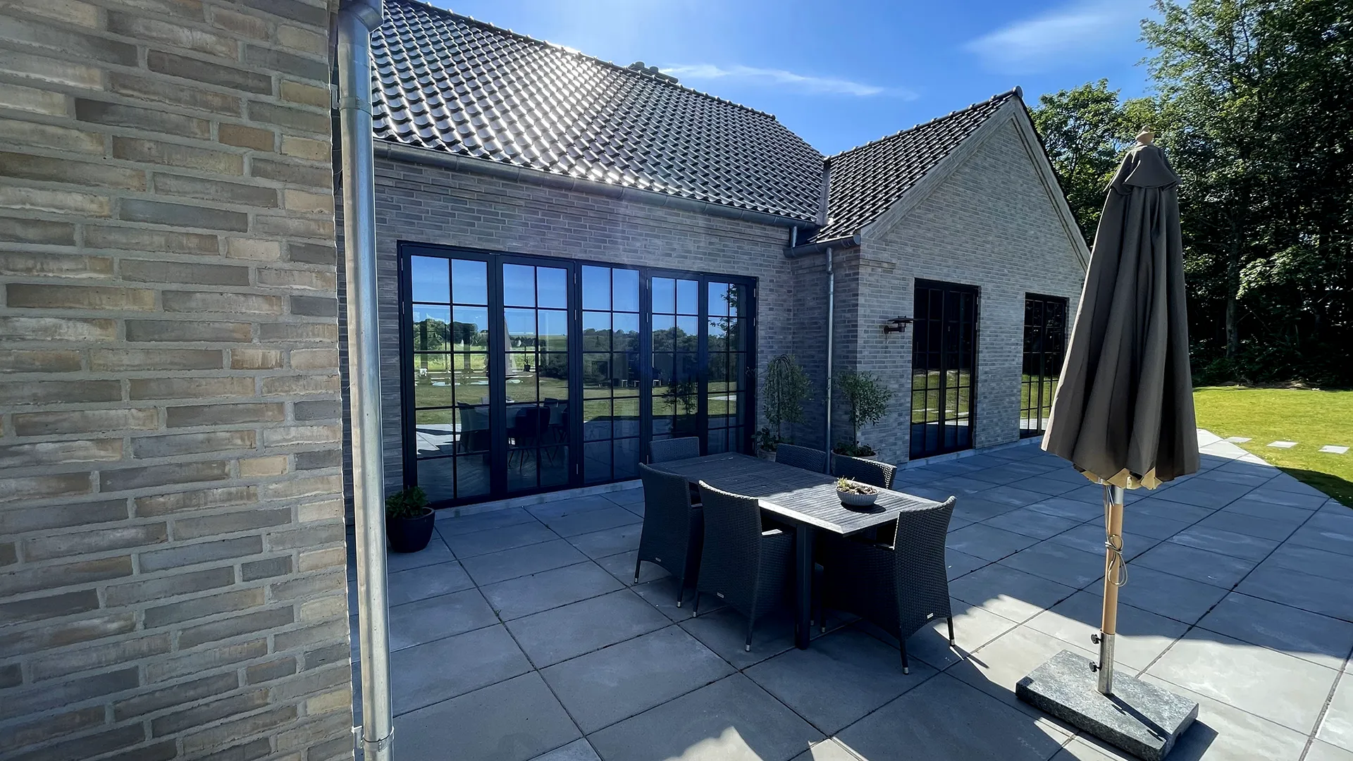 Terrassen i lyse, store fliser omkranser huset og skaber generøse udearealer, der inviterer til afslapning og samvær under åben himmel. Den flydende overgang mellem inde- og udeliv er nøje gennemtænkt, så beboerne kan nyde både solrige dage og milde aftener i private, naturskønne rammer.