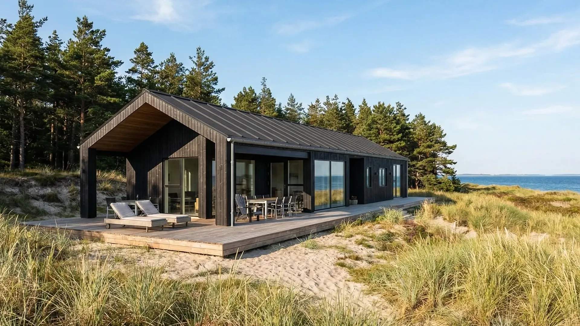 Facaden fremstår i sortmalet træ, hvilket skaber en rolig og underspillet kontrast til marehalmens støvede grønne nuancer. De store vinduespartier er strategisk placeret, så de ikke blot trækker dagslyset langt ind i boligen, men også udvisker grænsen mellem inde og ude. Når skydedørene åbnes, bliver naturen en integreret del af opholdsrummet.