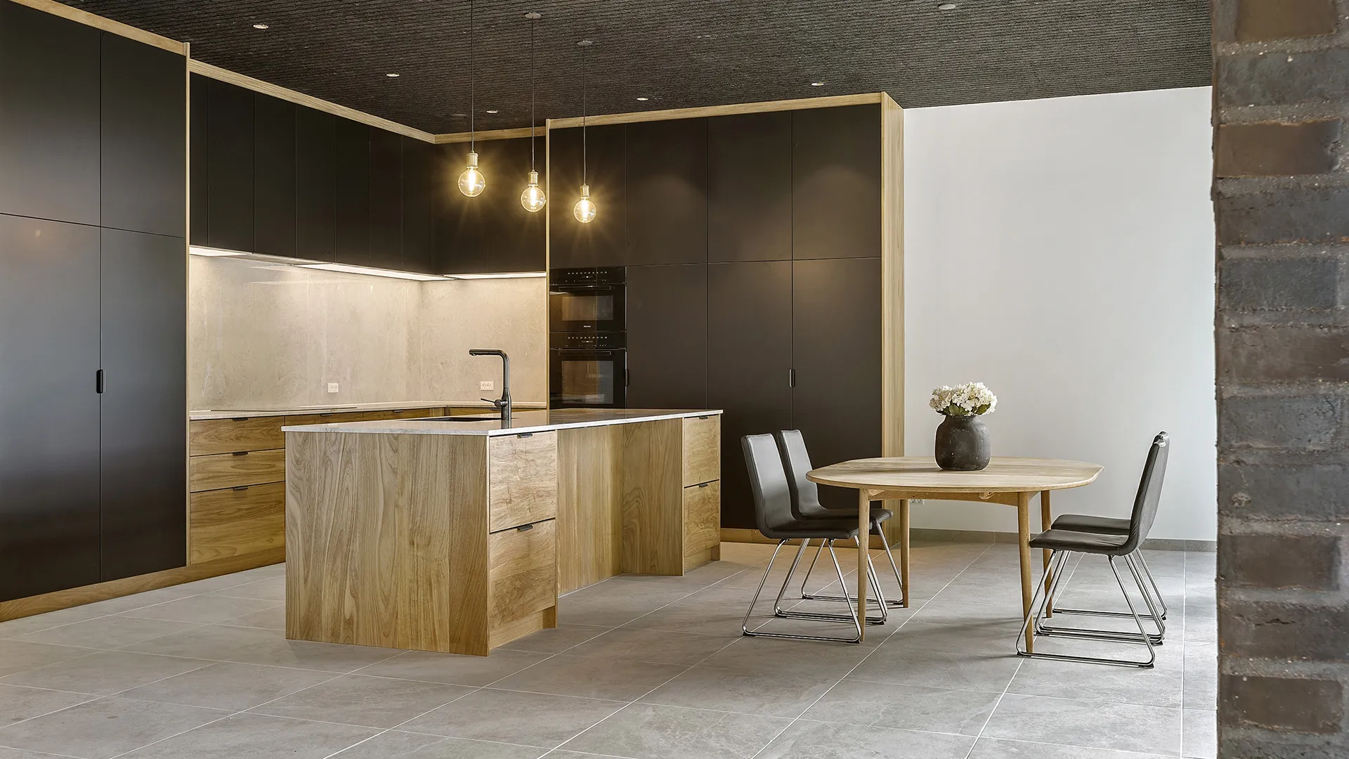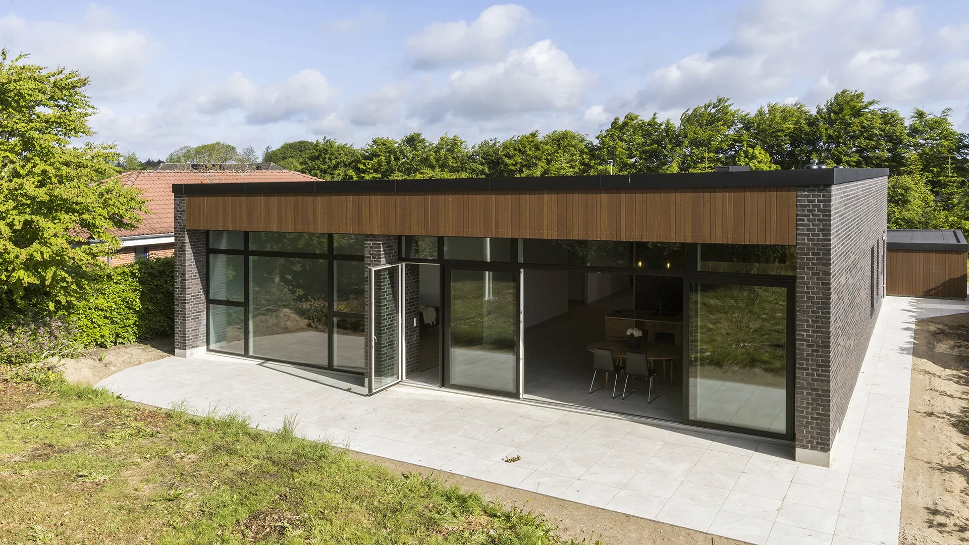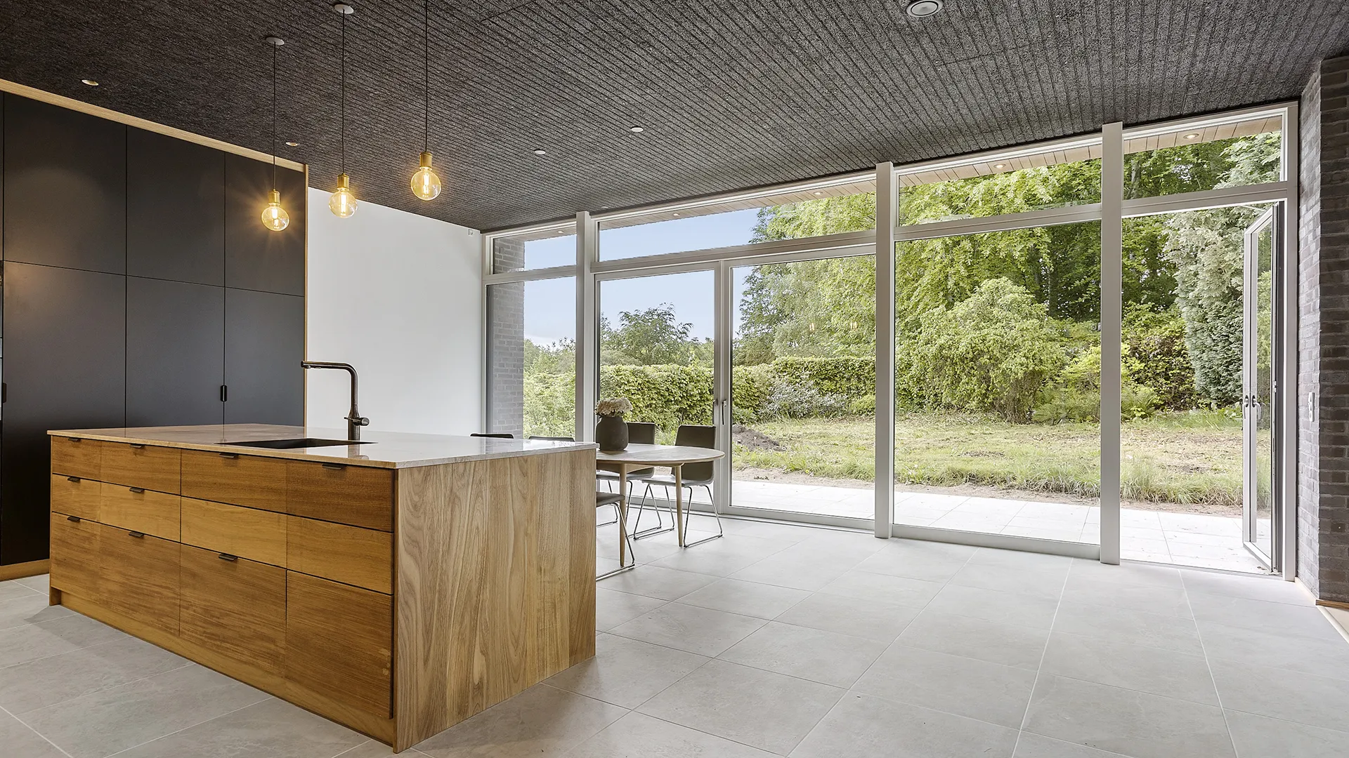 Facaden er bygget med de karakteristiske “Black Beauty” mursten fra Egernsund Tegl, hvis dybe, mørke nuancer skaber et changerende og tidløst udtryk. Murstenen komplementeres elegant af en varm og indbydende træbeklædning i et bæredygtigt bambusmateriale. Kontrasten mellem de mørke mursten og det lysere træ tilføjer dybde og karakter til husets ydre, og sikrer en smuk integration med de omkringliggende grønne omgivelser.