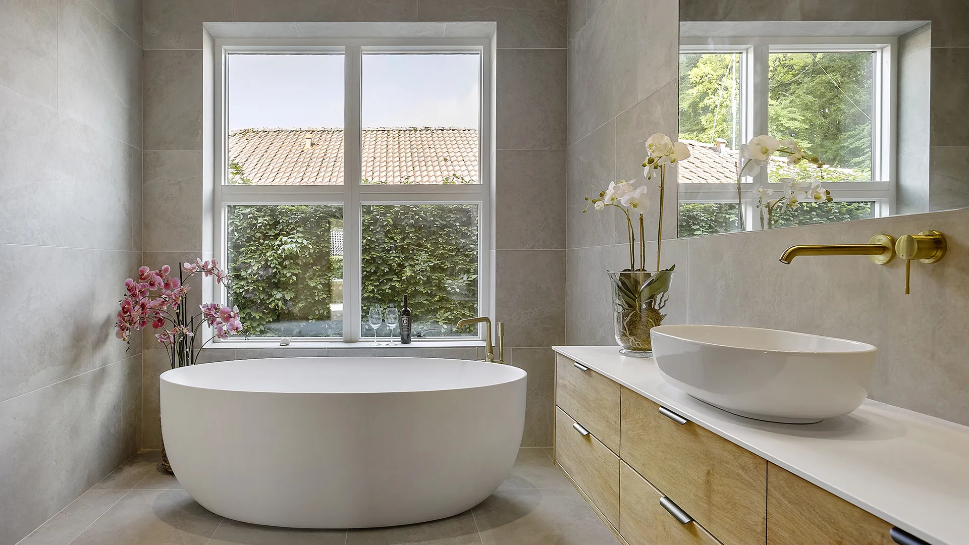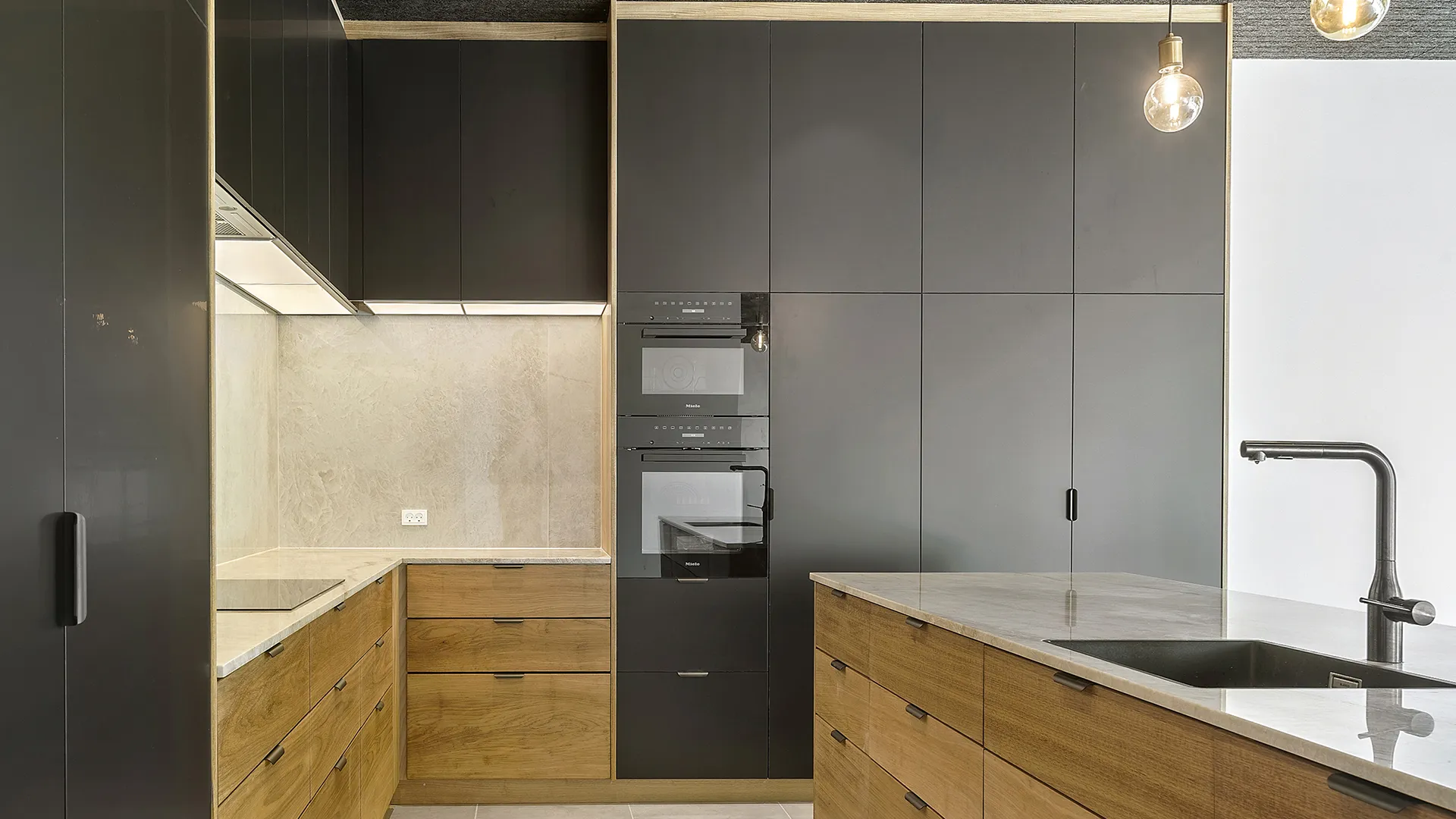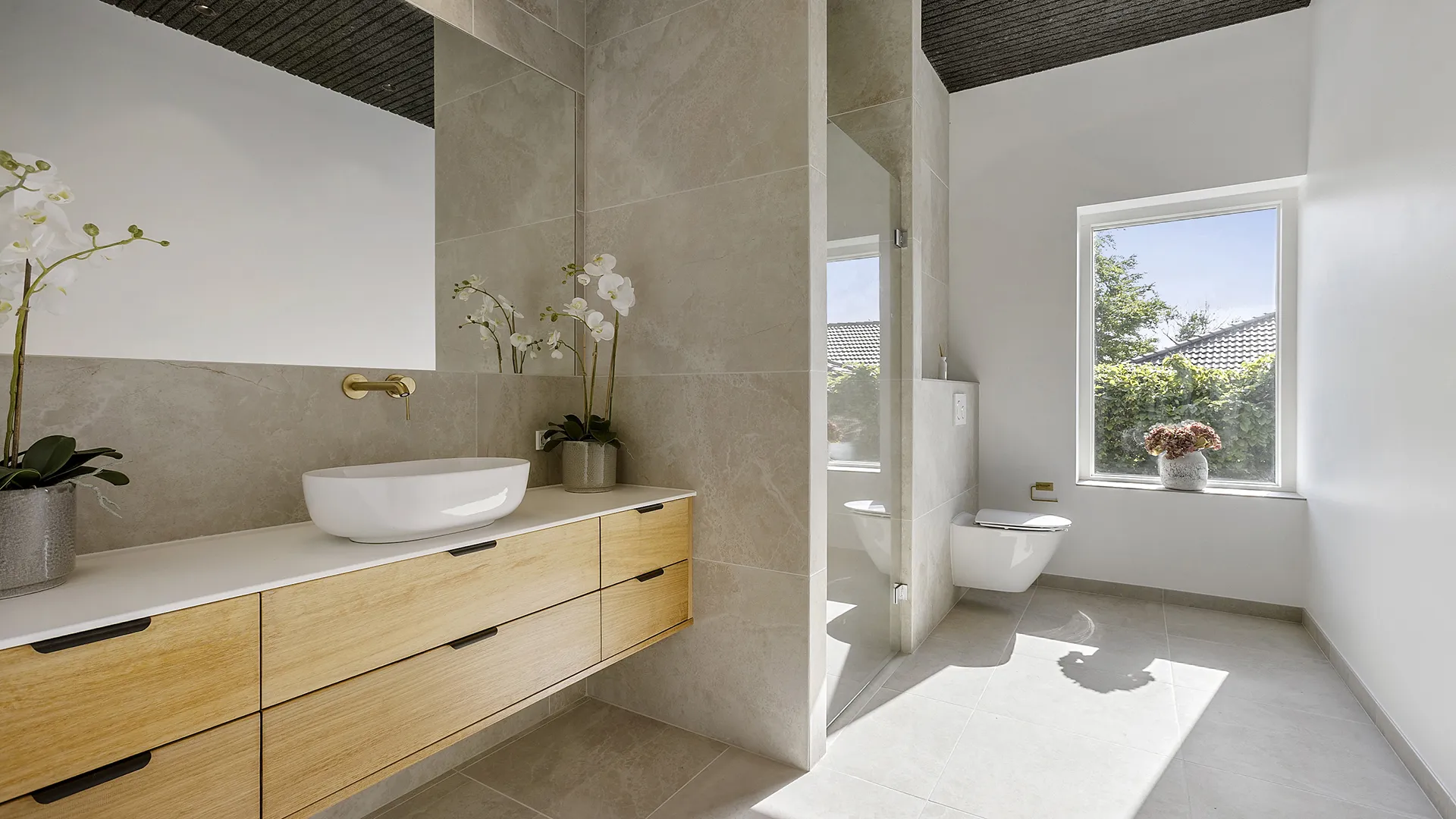 Facaden er bygget med de karakteristiske “Black Beauty” mursten fra Egernsund Tegl, hvis dybe, mørke nuancer skaber et changerende og tidløst udtryk. Murstenen komplementeres elegant af en varm og indbydende træbeklædning i et bæredygtigt bambusmateriale. Kontrasten mellem de mørke mursten og det lysere træ tilføjer dybde og karakter til husets ydre, og sikrer en smuk integration med de omkringliggende grønne omgivelser.
