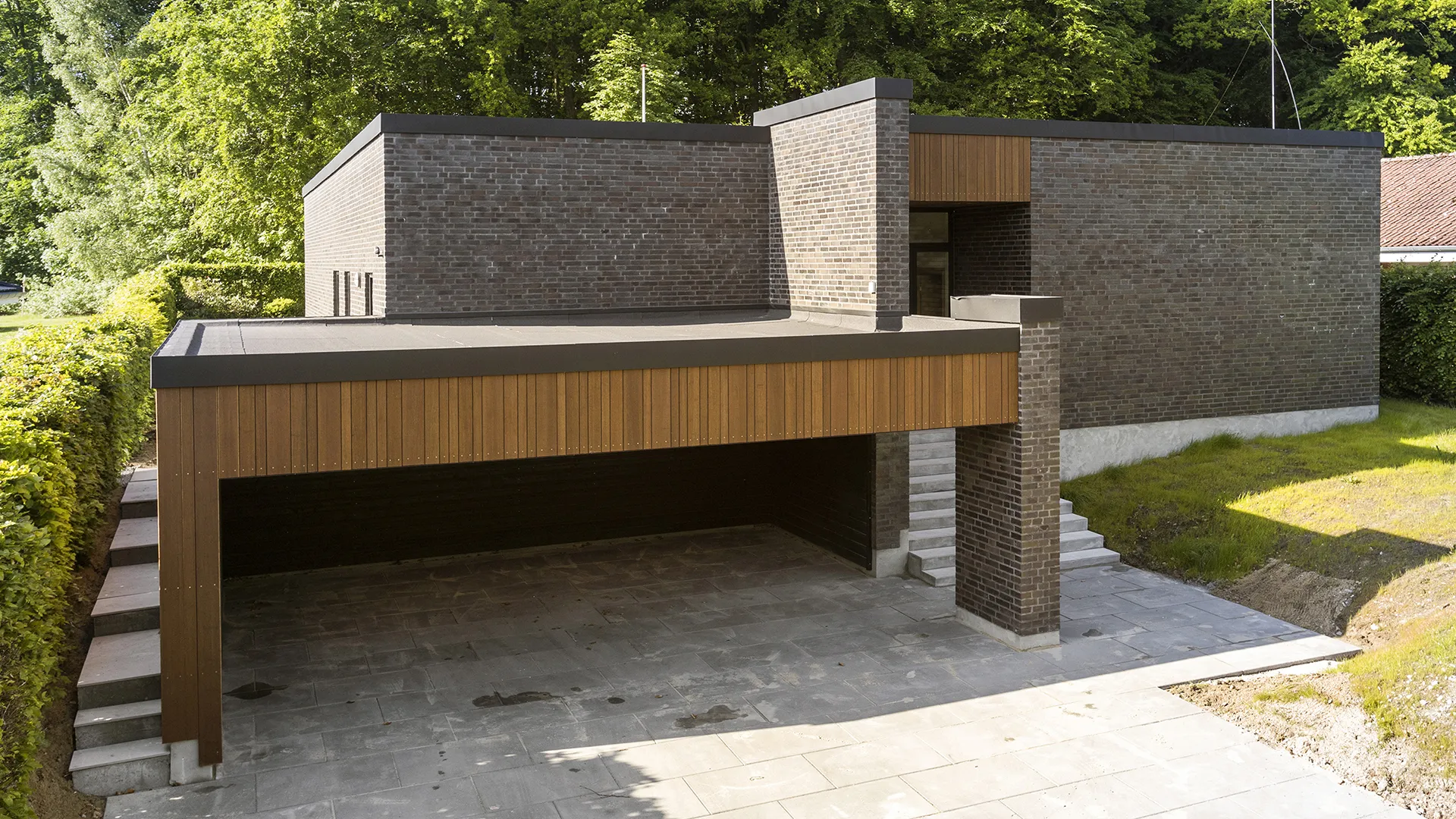 Ankomsten til huset markeres af indgangsparti med en integreret carport, der ikke blot beskytter køretøjer, men også danner en visuel ramme for trappen, der fører op til hovedindgangen.