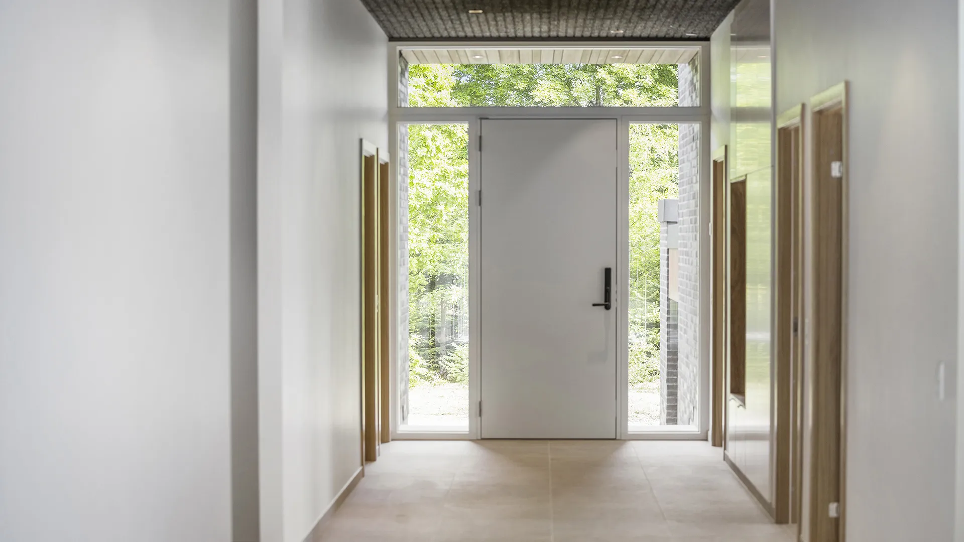Indenfor mødes man af en lys og rummelig entré, hvor store glaspartier giver et flot kig til naturen udenfor og sikrer et behageligt dagslys. Herfra åbner huset sig op og inviterer videre ind i de private rum.